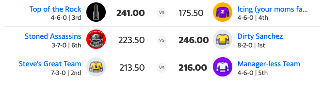 For the first time this season, a new team is at the bottom of the standings: Stoned Assassins, who dropped to 3-7 and into last place. The manager-less team who struggled in the beginning now find themselves tied for third with the Rock and Icing.