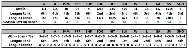The Rock is still chasing the game with goals, power-play points, and shorthanded points, but as a unit, the boys are still a force to reckon with when it comes to shots, hits, and blocks. The goalies may not be the best in the league in any category, but they are far from the worse. The three-headed monster continues to earn points and is a primary reason the team has seen its success so far to this point.