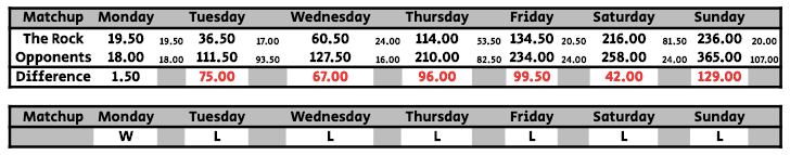 Steve’s team was the first to reach 100, 200, and 300 points, while the Rock barely got 100 and 200 before the end of the matchup. The deficit was at its highest on Sunday with 12900, but Steve’s team held a 96.00 and 99.50 point lead at one point. It wasn’t a complete shutout, though, as the Rock managed to keep a lead on Monday.