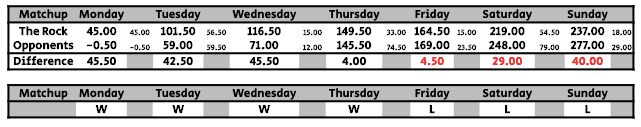 The matchup started with the Rock jumping out to a 45.50 point lead. They continued to keep the matchup in their favor, maintaining a 40 point lead through Tuesday and Wednesday. Icing came out of nowhere to tighten things up before cutting the deficit to just four points on Thursday night. Their momentum carried them to a lead on Friday (4.50) before adding to it on Saturday and closing it on Sunday. Week five marked the first season that the Rock held the lead after Wednesday and lost.