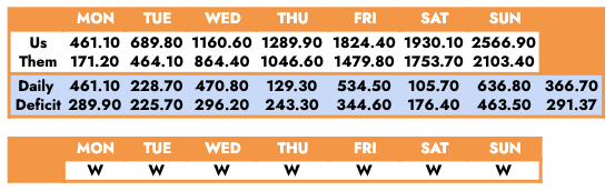The Plaza averaged 366.70 points and ran the daily deficit to 291.37. They were the first team to reach 500, 1000, 1500, and 2000 points in the matchup.
