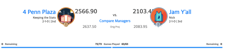 After spending the entire opening week’s matchup trailing, 4 Penn Plaza turned the tables on their opponents by holding the lead for all seven days. The closest Jam got to catching the Plaza was Friday when they cut the deficit to 176.40 points.