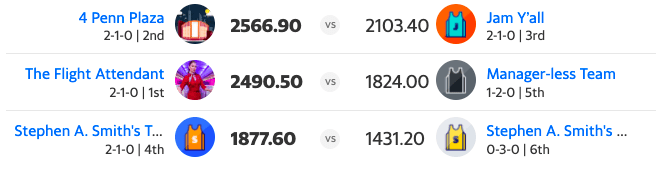 As mentioned in the opening, the Plaza scored 2566.90 points, tops in the league during the week. Two other teams collected more than 2000 points while three teams barely reached 1900. Only Stephen A. Smith’s team won without getting 2000 points with 1877.60. They beat up their sister team, SAS Genius Team, who finished the week as the lowest-scoring team with 1431.20 points.