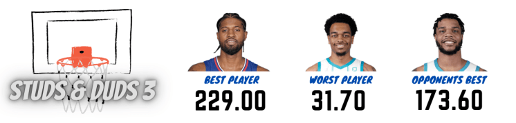 PJ Washington (Charolette) scored the least points (31.70) of all his teammates, earning him the worst player of the week award. Washington’s stat line included six free throw attempts, four made, three three-point attempts, two threes, 18 points, two offensive rebounds, three rebounds, one steal, and two blocks.