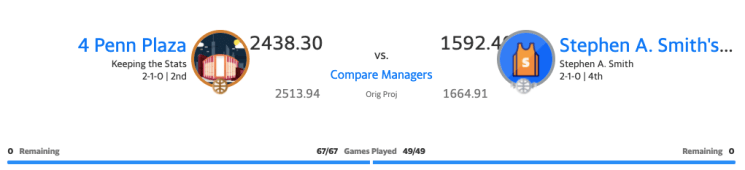 In week two, the boys found themselves stacked up against Stephen A. Smith’s Team, who were 2-0 heading into this matchup. The experts figured this would be a beatdown, projecting an 849.03 point victory for the New Yorkers, only they went above and beyond to secure an 890.90 point win 2438.30-1529.40.