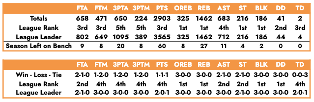 The rest of the statistics have stayed the same. The Plaza has collected the third most points and ranked third in the free throw department. The lowest totals are in three-pointers, where they rank fifth in attempts and shots made. Outside of those categories, assists rank fourth, less than 30 points from the league leader.