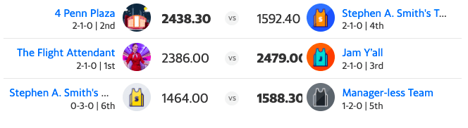 Three other teams scored less than 1600 points, and only the Manager-less Team managed to secure a victory with their 1588.30 points. As we close the book on week three, every team has found themselves on the losing end of the matchup while Stephen A. Smith’s Genius Team remains winless.