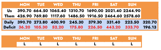 The Attendants largest lead occurred on Saturday (443.20), while the average daily deficit was close to 196.13 points. Overall the Plaza boys averaged 320.70 points a day.