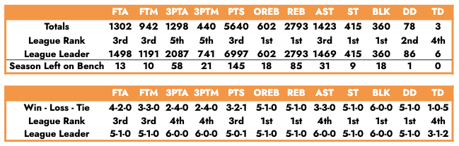 Every week we examine how the team is doing in overall statistics. After the loss in week seven, not much has changed. 4 Penn Plaza remains the top team in the most valuable categories, while most players stay near the top in double-doubles, free throws, and points scored.