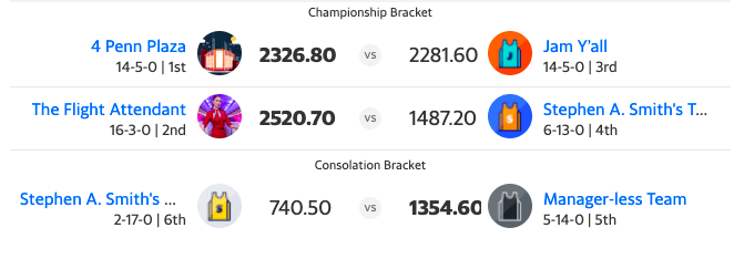 The Flight Attendant, the league’s best team for the entire season, earned their spot in the championship dance with a thousand-point beat down of Stephen A. Smith’s Team, who was fortunate enough to be in the playoffs. As usual, the Attendants were the best team of the week with 2520.70 points scored. Penn Plaza was second with 2326.80, while Jam Y’all was the only other team in the 2000 point club with 2281.60.