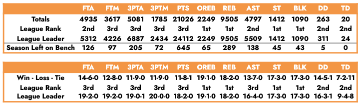 The Penn Plaza boys rank first or second in eight of the twelve categories they track numbers in with only one game left. Except for free throws made, three-pointers, and points scored, it can be argued that this team is one of the best in fantasy land.