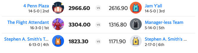 Just when people celebrated Penn Plaza’s 2966.60 points, The Flight Attendant stole their thunder by slaughtering the Manager-less Team by 1987.20 points, 3304.00-1316.80. This matchup has to be the most lopsided on the schedule and showcases that the Attendant is gunning for the championship.