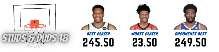 Joel Embiid (Philadelphia) gave everything he had to keep Jam Y’all in the matchup, producing 249.50 points. Despite his heroic efforts, which included 58/70 at the line and 6/14 from beyond the arc, his 132 points did little to slow down his opponents. With the highest player total on the scorecard, Embiid collected 44 rebounds, 17 assists, three steals, five blocks, and two double-doubles.