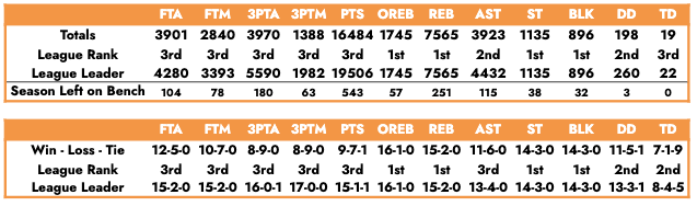 After 18 weeks, Penn Plaza owns the top two spots in half the league’s categories, ranking third in the remaining six categories. The goal was to hold both rebound categories, steals, and blocks. With only two weeks left in the season, it is safe to say mission accomplished. The team was not projected to be this good, but team management will take it and hope to succeed in the playoffs.