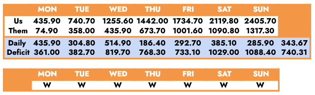 Wednesday turned out to be their best day with 514.90 points, which turned out to be their largest lead during the week, 819.70 points. The Manager-less Team barely scored 1300 points, waiting until Friday night to reach the thousand-point mark. The computer run team came within 228.90 points of achieving the same amount of points as the final deficit turned out to be.