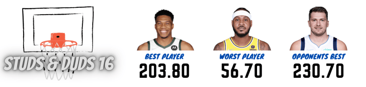 Carmelo Anthony (Los Angeles) had the team’s lowest point total of the week with 56.70. His numbers included making four of his six free throws and connecting on seven of nine three-pointers. He finished with 31 points, 11 rebounds, two assists, and three blocks.