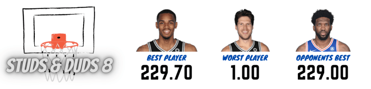 Dejounte Murray (San Antonio), one of the Plaza’s draft gems, took home his first best player award in this week’s matchup. His 229.70 points led all shooters as the only player to surpass 200 points in a tightly contested matchup. Murray’s stat line read like this: 5/7 at the free-throw line, 7/18 from downtown, 68 points, 43 total rebounds, 44 assists, nine steals, one block, two double-doubles, and one triple-double. This week’s worse player was Murray’s San Antonio teammate Doug McDermott who collected just a single point on two free-throw attempts.