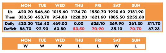 When people examine the daily box scores, most would be surprised that Plaza actually led the matchup four days to three; however, Jam Y’all won the most critical day, Sunday. A further look into the numbers will show that it was more significant when Plaza had the lead than the numbers Jam led by.