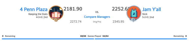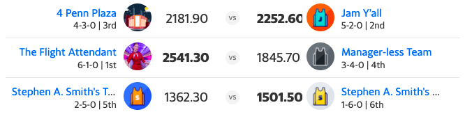 The experts predicted this would be a close matchup, 73.21 points, and in the end, the deficit was even closer at 70.70 points. Both teams failed to live up to their initial projections but duked it out until the final buzzer handed Jam Y’all a victory to improve to 5-2. The loss dropped 4 Penn Plaza to 4-3, only one game over .500.