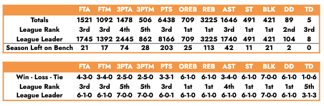 The lowest ranking out of the 12 categories is three-pointers made, where Plaza sits in fifth place with just 506 baskets on 1478 attempts. The team has no sixth place rankings, with the rest of the categories sitting between second, third, and fourth.