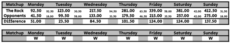 The matchup opened with the Rock jumping out to a significant 51 point lead, 92.50-41.50. On Tuesday, the two battled it out, cutting the deficit in half to just 23.50 before it ballooned to 84.50 on Wednesday. That was the final day; the matchup was close because the Rock jumped ahead by triple digits on Thursday and finished it with a 137.50 point win.