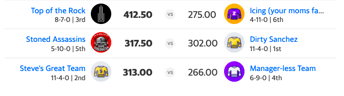 Four of the six teams scored over 300 points, with Stoned Assassins and Steve’s Great Team picking up wins. Dirty Sanchez, the league’s best team, scored 302.00 but suffered their fourth loss of the season.