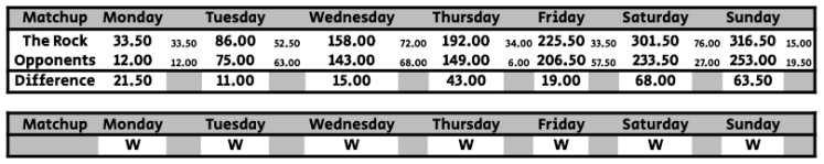 Just when the Assassins saw their opportunity to tie or take over the matchup, the Rock responded with a week best 76 points on Saturday, giving them a 68 point advantage, their most significant of the week. With just one day left on the schedule, it would have been hard for their opponents to overcome such a steep deficit, and the Rock put it on cruise control, winning 316.50-253.00.