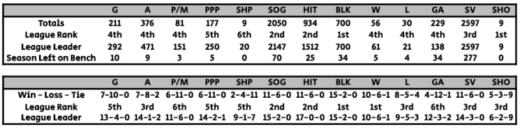 In week 16, the Rock players became the best team at blocking shots, and the boys held onto that crown a week later. The goalies have also collected the most shutouts giving the Rock two first-place rankings.