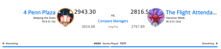 Their first championship was no walk in the park. The league’s best team (The Flight Attendant) for 22 weeks stood in the way, drooling at the opportunity to avenge a week 17 defeat that gave them a 16-3 record to finish the season. Despite everything they threw at Penn Plaza, a dozen roster moves kept the best lineup on the court at all times, which led to the eventual upset win.